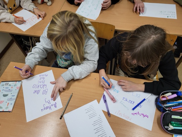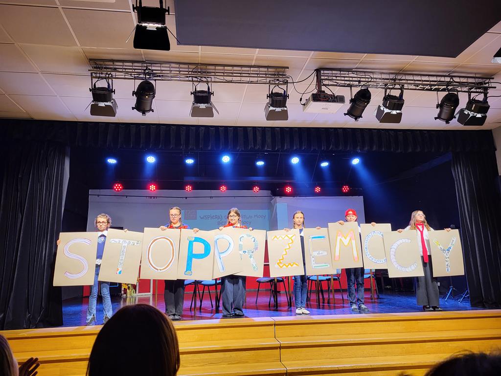 Z klasą 6 wzięliśmy udział w finale akcji Dzieciństwo bez Przemocy. Dzieci przygotowały piosenkę o byciu razem pt."All together". Później dzieci fantastycznie wcieliły się w role aktorskie i odegrały scenkę mini-performance pt. „English lesson – don’t bully”, a występ zakończył się żywym napisem z literkami, tworzącymi napis: Stop Przemocy.