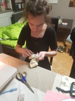 Kolejna uczestniczka zajęć Julia Wiszowata w domu podczas wykonywania ozdoby świątecznej i efekt jej pracy.