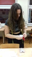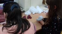 Uczestniczki pracowni kroju i szycia podczas pracy i gotowe fanty.