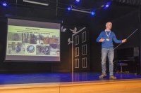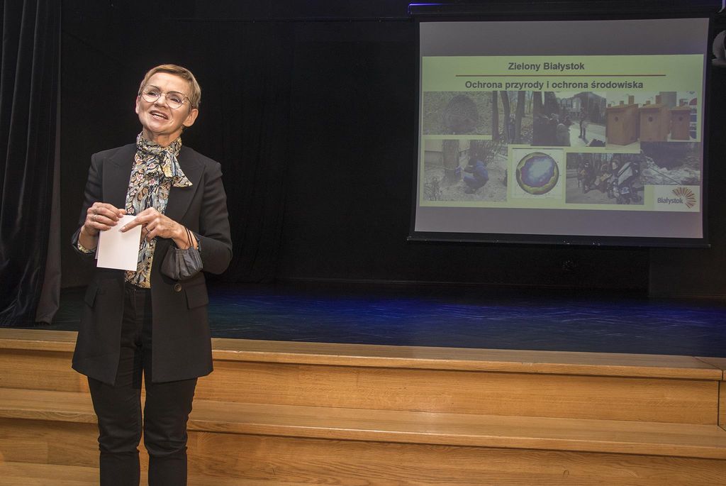 Uczestnicy imprezy wysłuchali prelekcji dotyczącej ochrony środowiska w Białymstoku, którą przedstawił Jędrzej Grygoruk z Departamentu Ochrony Środowiska Urzędu Miejskiego w Białymstoku.