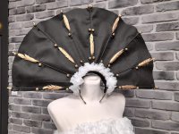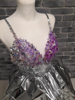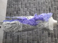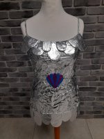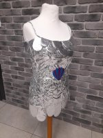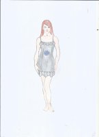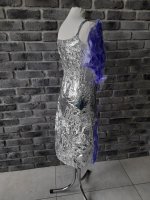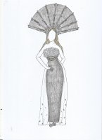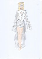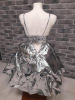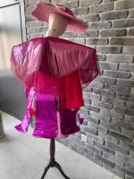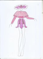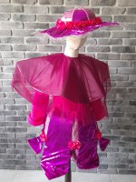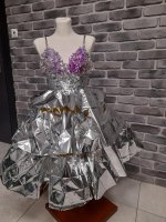Ubiór trzyczęściowy powstał z białej tkaniny (koszule męskie)i firan gładkich oraz wzorzystych. Górna część ubioru w formie gorsetu dopasowanego do sylwetki za pomocą zaszewek gorsowych w przodzie, zaszewek pionowych w tyle i fantazyjnych cięć. Rękawy długie, trzywarstwowe. Dół gorsetu wykończony trzywarstwową baskinką. Dolna część ubioru- krótkie spodenki z tkaniny w kolorze białym.