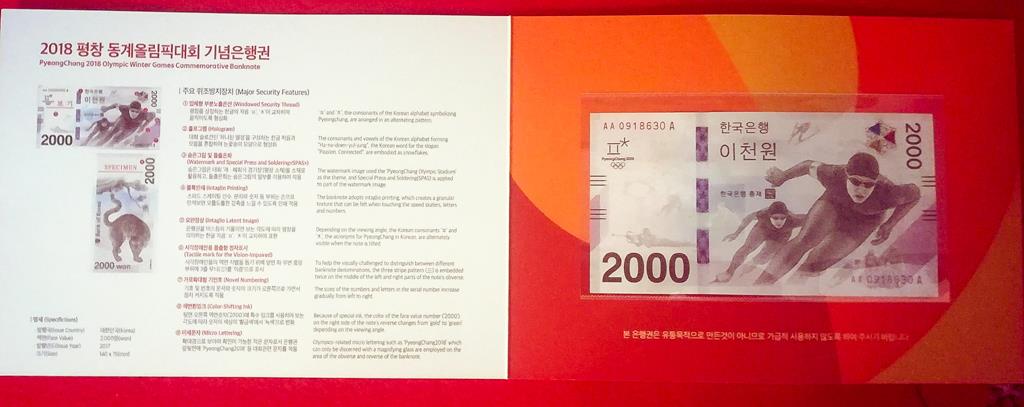 - Olimpijski banknot Pjongczang 2018 to pierwszy okolicznościowy banknot w historii wydany przez Koreański Bank Centralny. Na jego awersie zaprezentowano sportowców uprawiających siedem wybranych dyscyplin sportowych, m.in.: skoki narciarskie, hokej czy biatlon. Głównym motywem przedstawionym na banknocie jest łyżwiarstwo szybkie /jedna z najstarszych dyscyplin zimowych igrzysk i pierwsza, w której koreańska drużyna narodowa startowała na igrzyskach w Sankt Moritz w 1948 r./ Pędzących łyżwiarzy szybkich przedstawiono na tle słynnych koreańskich gór w prowincji Gangwon. Rewers banknotu nawiązuje do barwnej kultury i historii Korei. Możemy na nim zobaczyć tradycyjny obraz Kim Hong-do, słynnego koreańskiego artysty z XVIII wieku, ukazujący białego tygrysa pośród pędów koreańskiej sosny. Tygrys jest jednym z głównych elementów koreańskiej mitologii. Jednocześnie wybrany został na maskotkę igrzysk w Pjongczang;