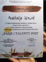 Anastazja Szewiel, uczestniczka zajęć plastycznych prowadzonych przez Monikę Sienkiewicz, została laureatką IX Międzynarodowego Biennale Twórczości Plastycznej Młodych "Pasje i Talenty 2022". Praca uczennicy znalazła się w międzynarodowym gronie nagrodzonych z: Polski, Chin, Uzbekistanu, Rumunii, Białorusi i Ukrainy. Serdecznie gratulujemy i życzymy dalszych sukcesów wychowance Młodzieżowego Domu Kultury w Białymstoku.