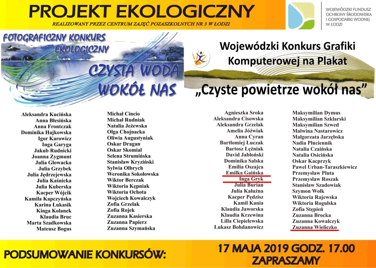 Emilka Gaińska, Inga Gryk i Zuanna Wieliczko uczestnicy zajęć informatycznych (instruktor Robert Laskowski) zostali laureatami wojewódzkiego konkursu grafiki komputerowej pn.: „Czyste powietrze wokół nas”.