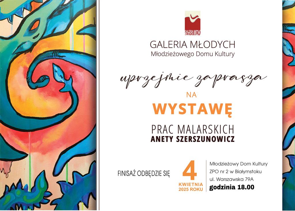 Galeria Młodych Młodzieżowego Domu Kultury w Białymstoku, ul. Warszawska 79 A, uprzejmie zaprasza na wystawę prac malarskich Anety Szerszunowicz. Finisaż odbędzie się 4 kwietnia 2025 roku o godz. 18.00 w siedzibie placówki.