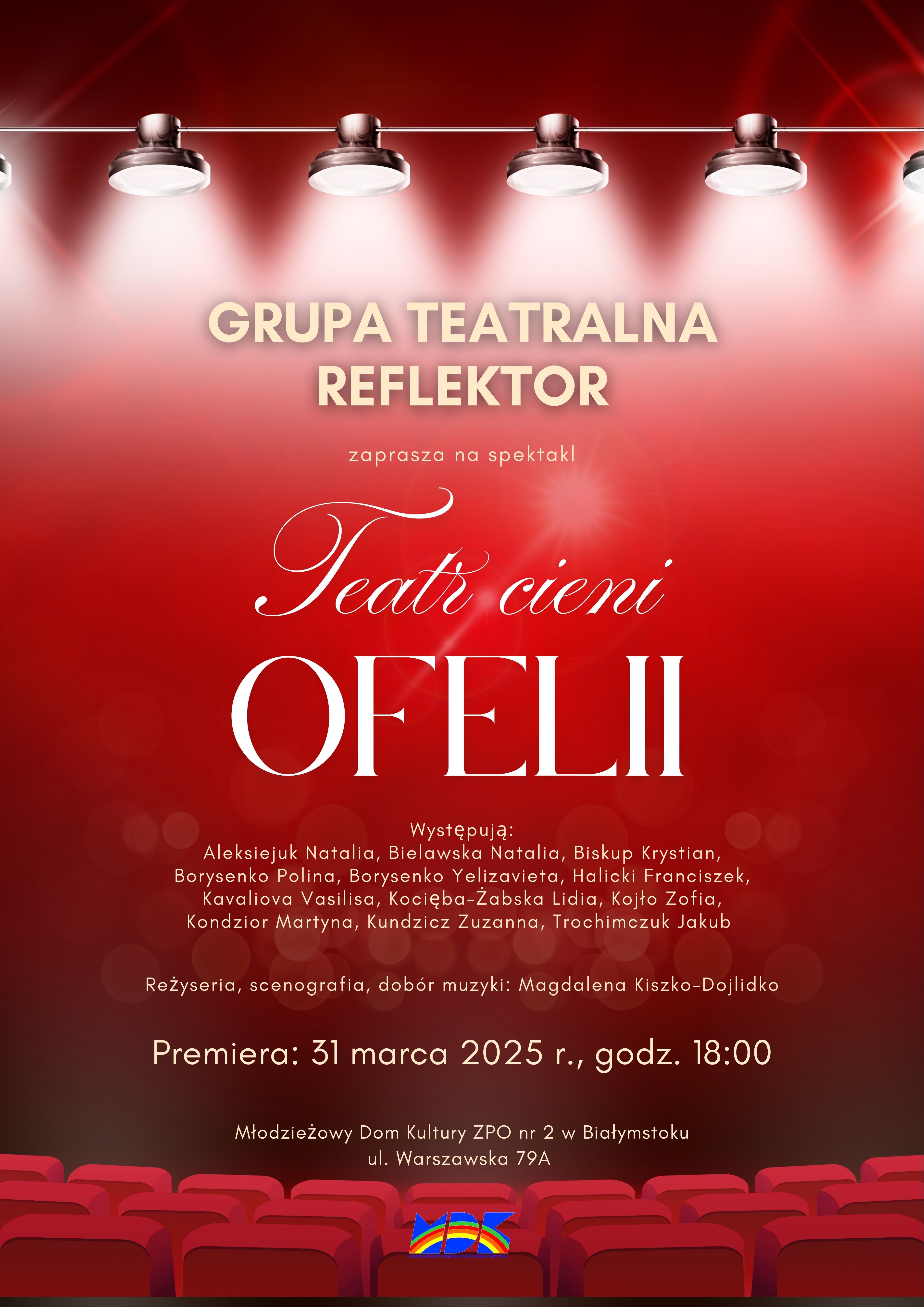 Grupa Teatralna „Reflektor” oraz Młodzieżowy Dom Kultury ZPO nr 2 w Białymstoku serdecznie zapraszają na spektakl pt. „TEATR CIENI OFELII”. Premiera odbędzie się 31 marca 2025 roku o godzinie 18.00 w siedzibie placówki ul. Warszawska 79A.